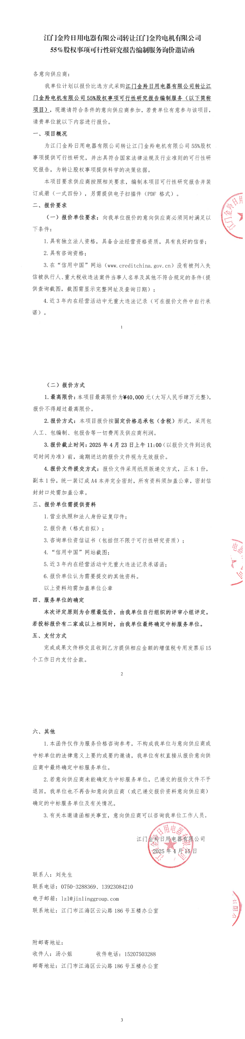 江门金羚日用电器有限公司转让江门金羚电机有限公司55%股权事项可行性研究报告编制服务询价邀请函