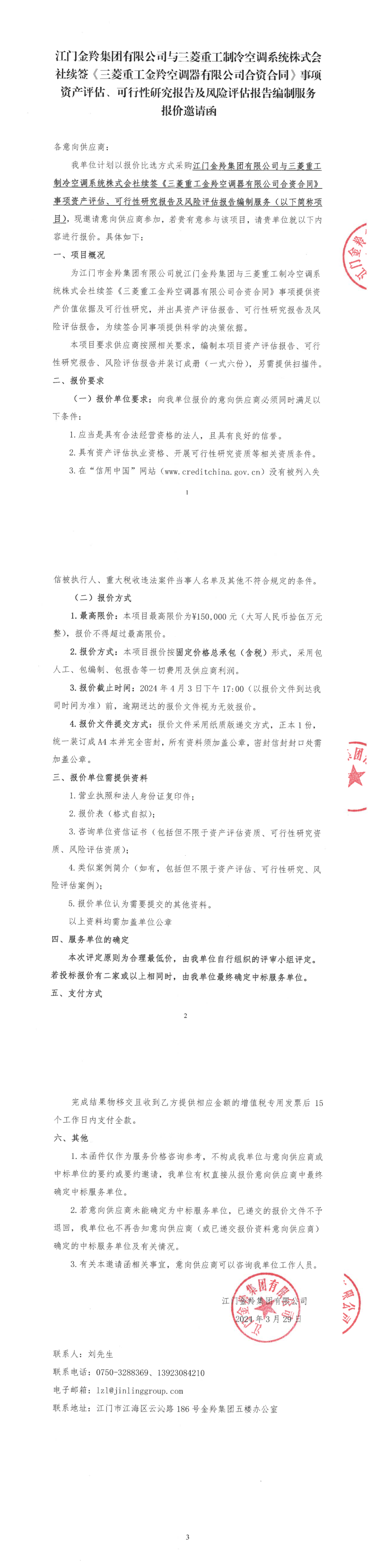 江门金羚集团有限公司与三菱重工制冷空调系统株式会社续签《三菱重工金羚空调器有限公司合资合同》事项资产评估、可行性研究报告及风险评估报告编制服务报价邀请函