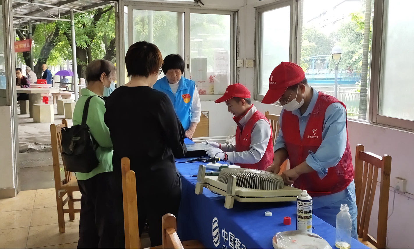 活动现场设有小家电志愿维修服务、义剪服务、测量血压、垃圾分类宣传小游戏等摊位,向社区居民倡导文明、健康、和谐的生活理念,为参加活动的群众提供多种多样的志愿服务。义工队员们与天健社工分工合作,一小分队在小游戏摊位协助天健社工,另外一小分队维修小家电,吸引了大批社区居民参与活动。