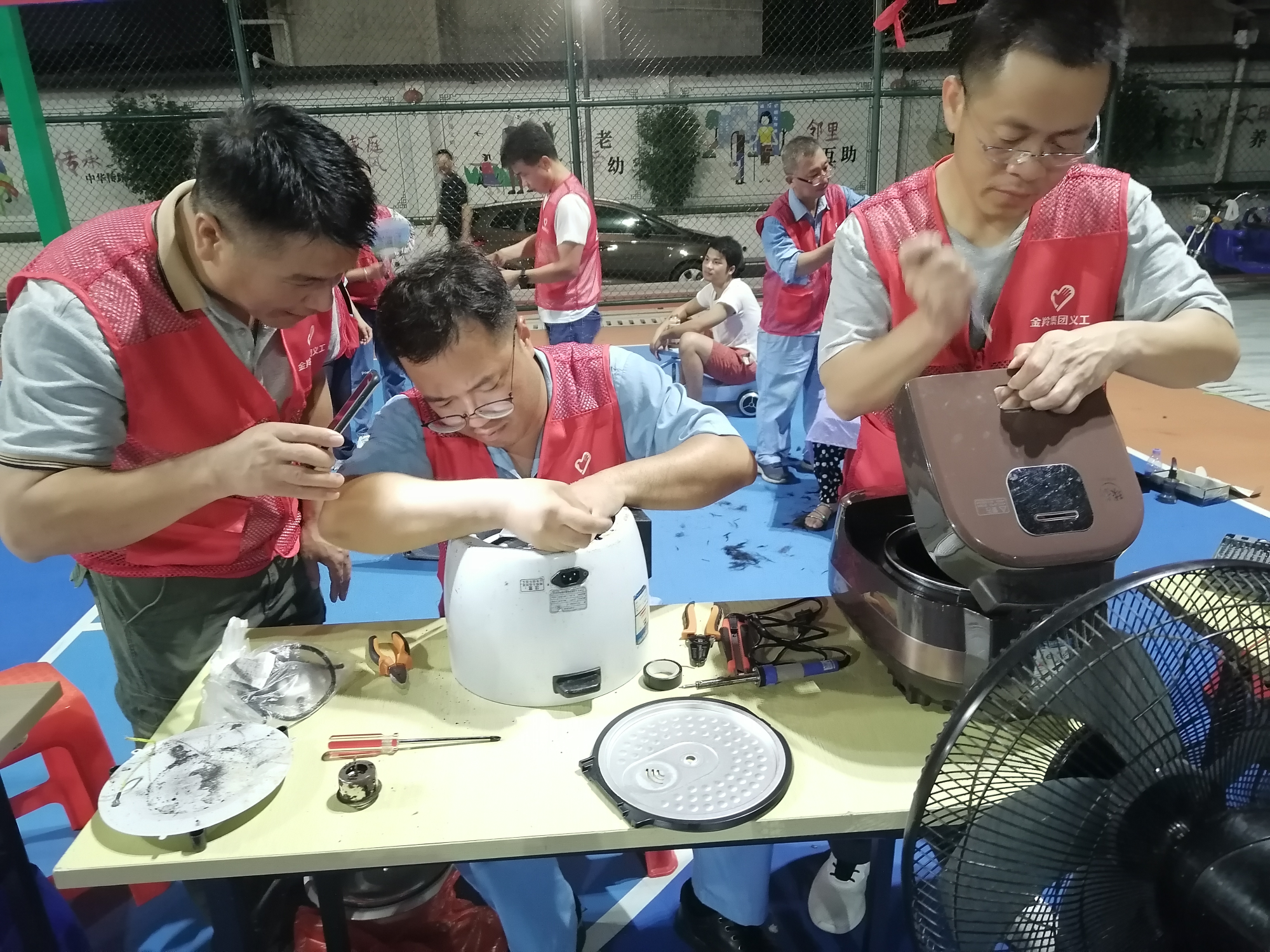 活动当晚,金羚集团10多名党员志愿者早早来到社区,放置好各自工具摆好摊位,等待居民的到来。活动现场,闻讯赶来的居民陆陆续续从家中拿来不能正常工作的电风扇、电热水壶、电饭煲、电磁炉等小家电让志愿者们“会诊”。志愿者热情接待前来维修家电的居民,认真查找故障原因,仔细检查维修每件小家电,并将居民群众送来的电器一一维修好。