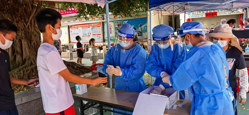 7月8日-13日,江海区和蓬江区疫情防控核酸检测点都出现金羚集团应急救援党员突击队队员的身影,他们闻令而动、尽锐出战,在收到上级指令半小时内就集结到支援点,以实际行动助力疫情防控。作为疏导员,他们穿梭于人群中,引导社区居民守秩序、排好队;帮扶年事已高、妇女幼童优先安排核酸检测;为没有智能手机或手机出现故障的居民提供核酸检测码打印服务。作为核酸码检测员,他们坚守岗位,引导居民进行检验核酸码,耐心为长者解决核酸码的问题。