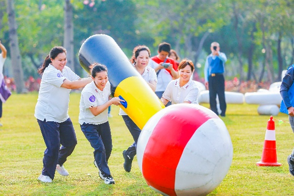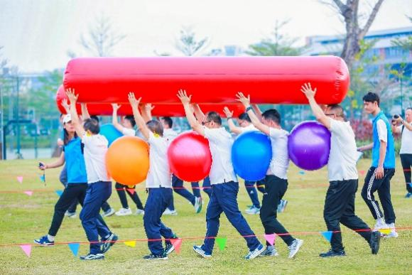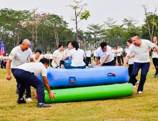 每个项目比赛过程中,各队队员团结一心,奋力拼搏,求协调、争速度。队伍与队伍之间斗智斗勇,精神振奋,斗志昂扬。围观的队友呐喊声震天,欢笑声不断,赛场内外,都洋溢着欢乐的气氛。