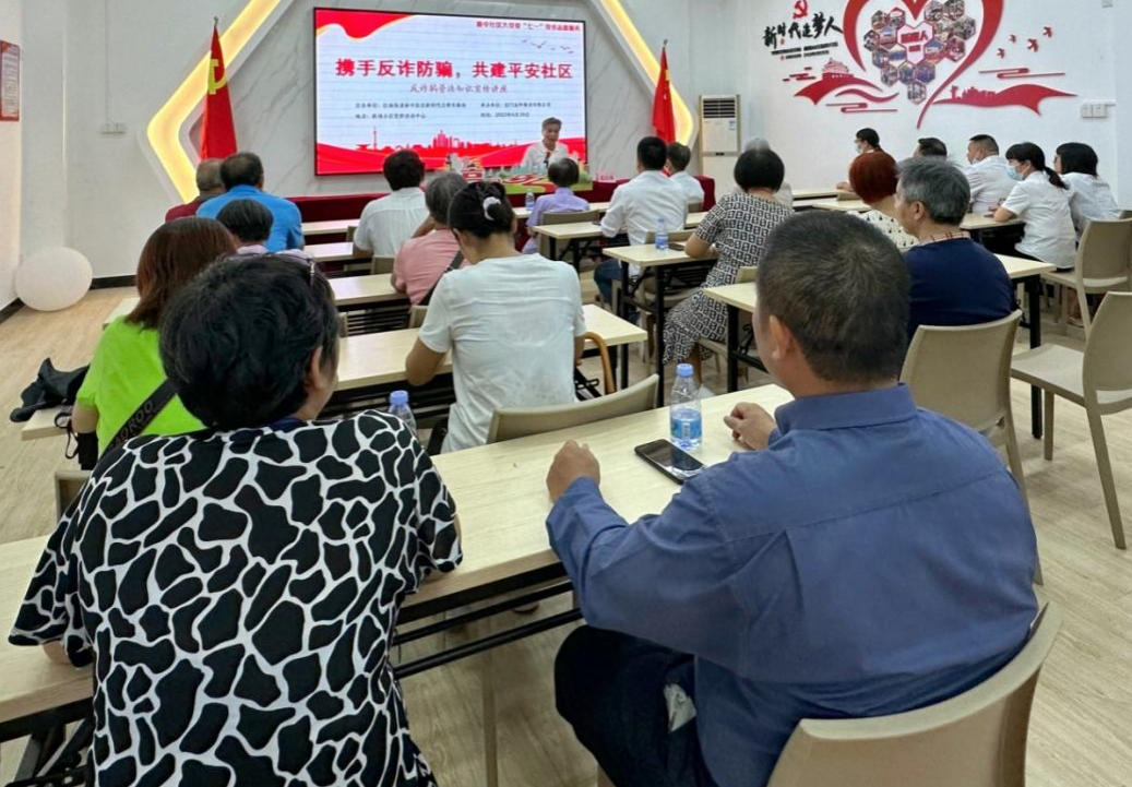 活动当天,在新南小区,党员志愿者开展了反电信诈骗法宣传活动,通过发放宣传资料、现场案例讲解等方式,向群众宣传电信诈骗危害以及防范方法,助力维护人民群众财产安全、社会安定。